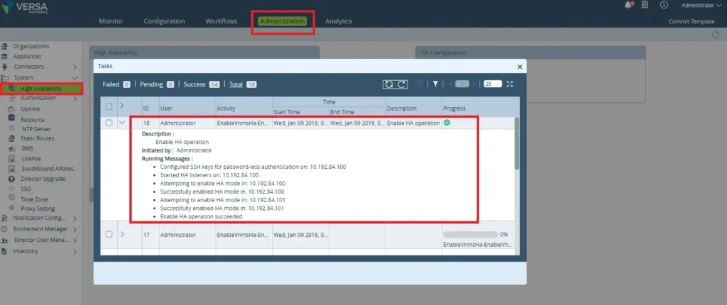 Once the HA configuration is applied, verify the completion of HA configuration from the Tasks window.