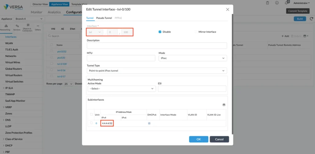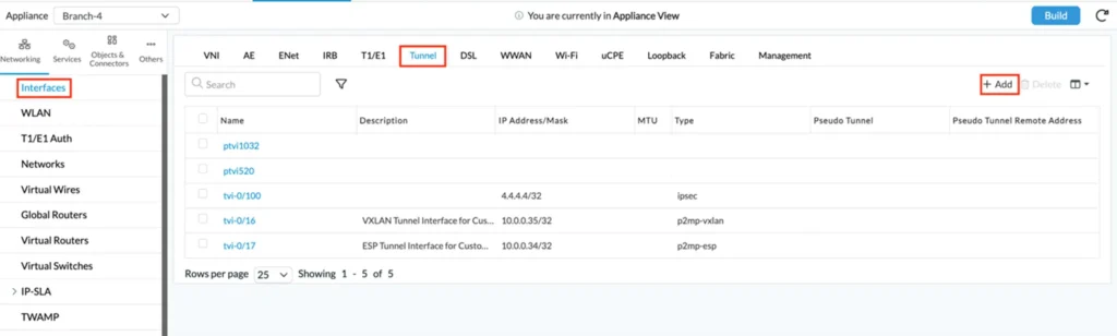 admin@Branch-4-cli> show orgs org Customer2 sessions brief VSN VSN SESS DESTINATION SOURCE DESTINATION ID VID ID SOURCE IP IP PORT PORT PROTOCOL NATTED SDWAN APPLICATION --------------------------------------------------------------------------------------------------- 0 2 1 11.0.0.10 11.0.0.0 1154 1234 6 No No -The solution for this scenario is to emulate an OSPF intra-area link between the SD-WAN appliances over the SD-WAN network which results in prefixes being advertised as iA instead of E2 between the two respective sites. Basically, this is similar with the OSPF shamlink feature coming from the MPLS L3VPN world. shamlink feature is supported in the VOS. Now, let’s move to the configuration side. The first step is to create 2 tvi on the branches (4.4.4.4 on Branch-4 and 5.5.5.5 on Branch-5) and add those to the LAN-VR and Orgs-Limit. These tvi addresses must be advertised in MP-BGP between the sites and as a result there will be reachability between them. Only Branch-4 is being shown but same operation will have to be performed on the remote Branch. These tvi will be used as support to build the shamlink between the sites.