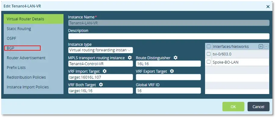 – Choose “Routes-from-LAN-BGP”under Import and “Route-to-LAN-BGP” under Export