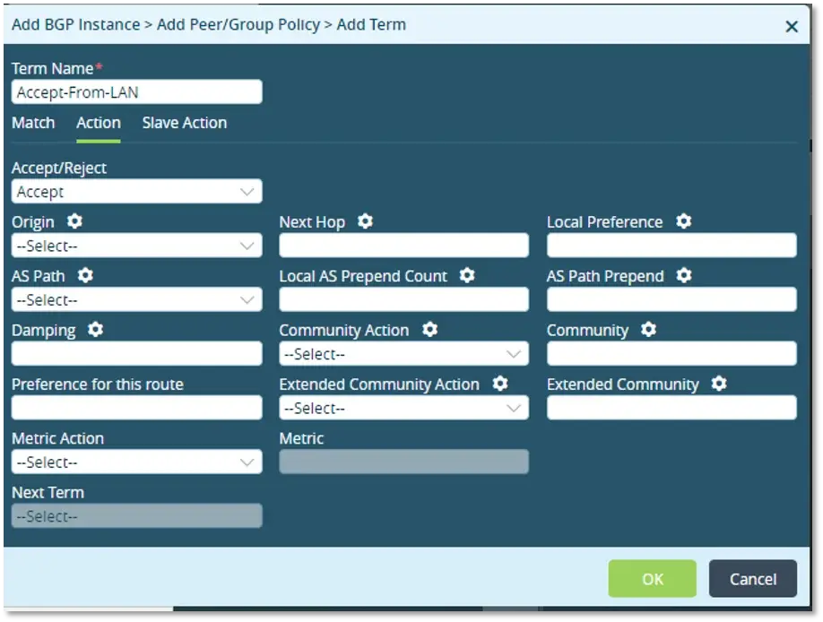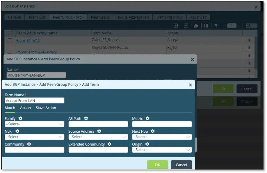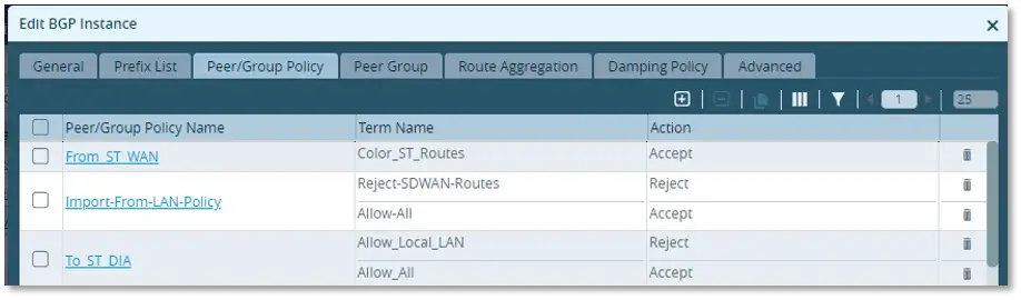 – Add an Export Policy “Advertise-to-LAN” and set action to “Accept” to export routes learnt on SDWAN LAN routing instance into the BGP