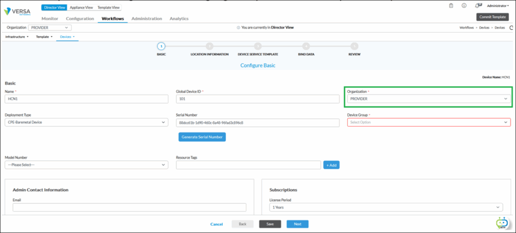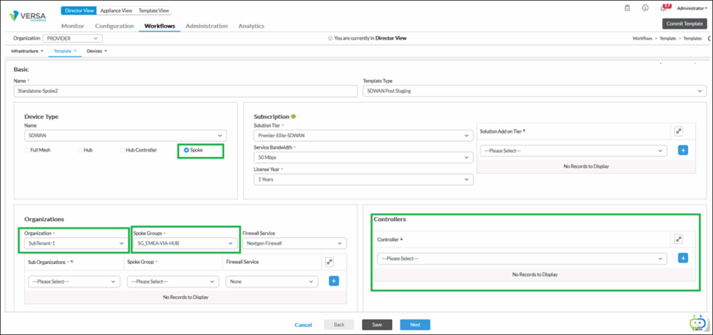 2. In the Basic Tab, Select the Device Type ‘Spoke’, the subscription, the organization, and eventually Sub Organization(s), the Spoke Groups for each organization. Note that the Controller field must be let blank.