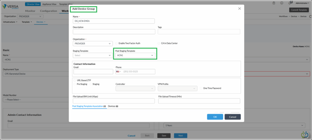2. In the Basic Tab, Select the Organization, and the Device Group (Add a new one if needed), referencing the Post staging template created previously.