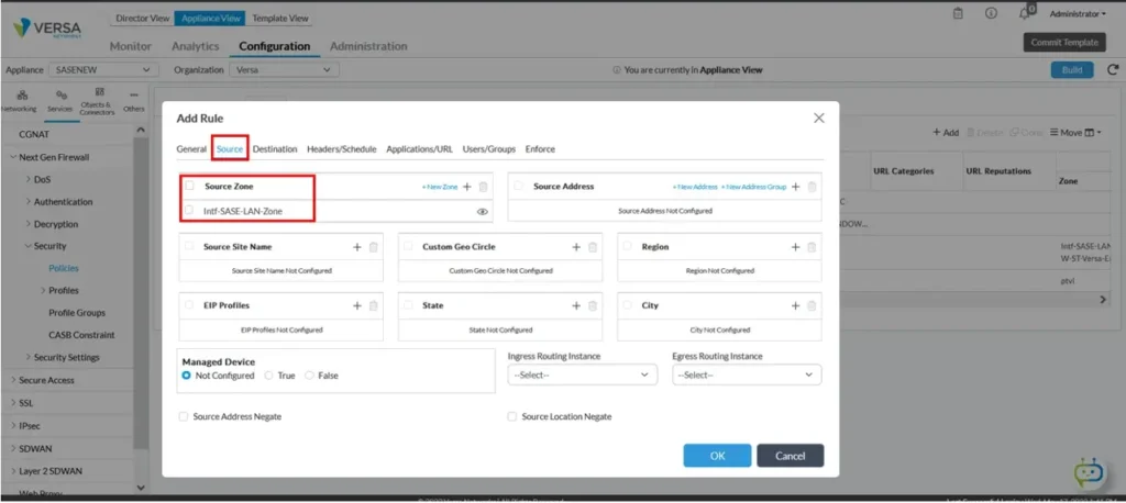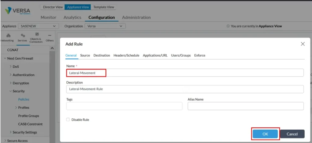 ☞ It is assumed that an Administrator following this article is aware of basic Firewall policies/rules configurations using Versa Director and latest security pack is installed on the VOS.