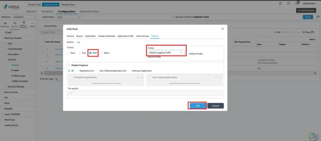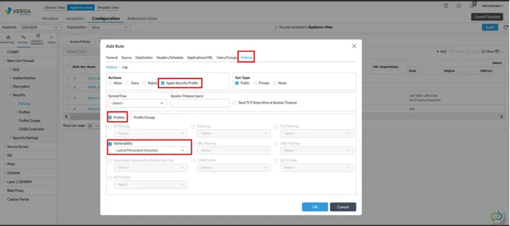 Select “Apply Security Profile” under the Enforce tab and then enable “Vulnerability” checkbox. From the dropdown menu select Versa pre-defined “Lateral Movement Detection”.
