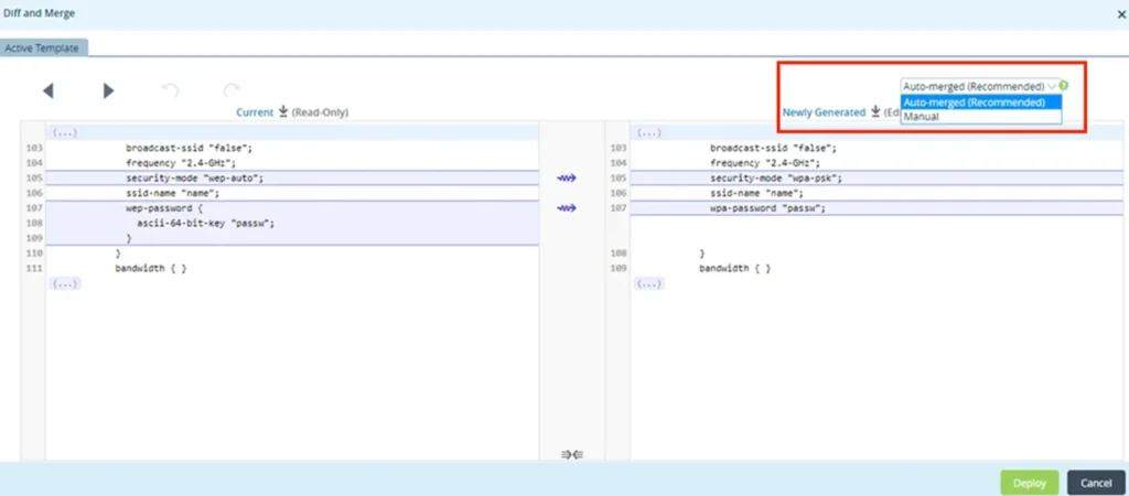 Auto Merge: The system will try to merge the new configuration from the Template into the existing appliance configuration. If any appliance level configuration changes are done, then they will over-ride the new configuration and the existing appliance context is preserved.