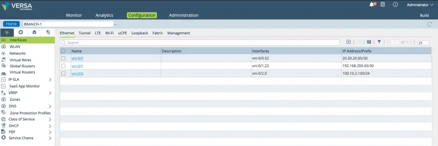 The screenshot below shows the interface configurations that are present in Versa SD-WAN CPE