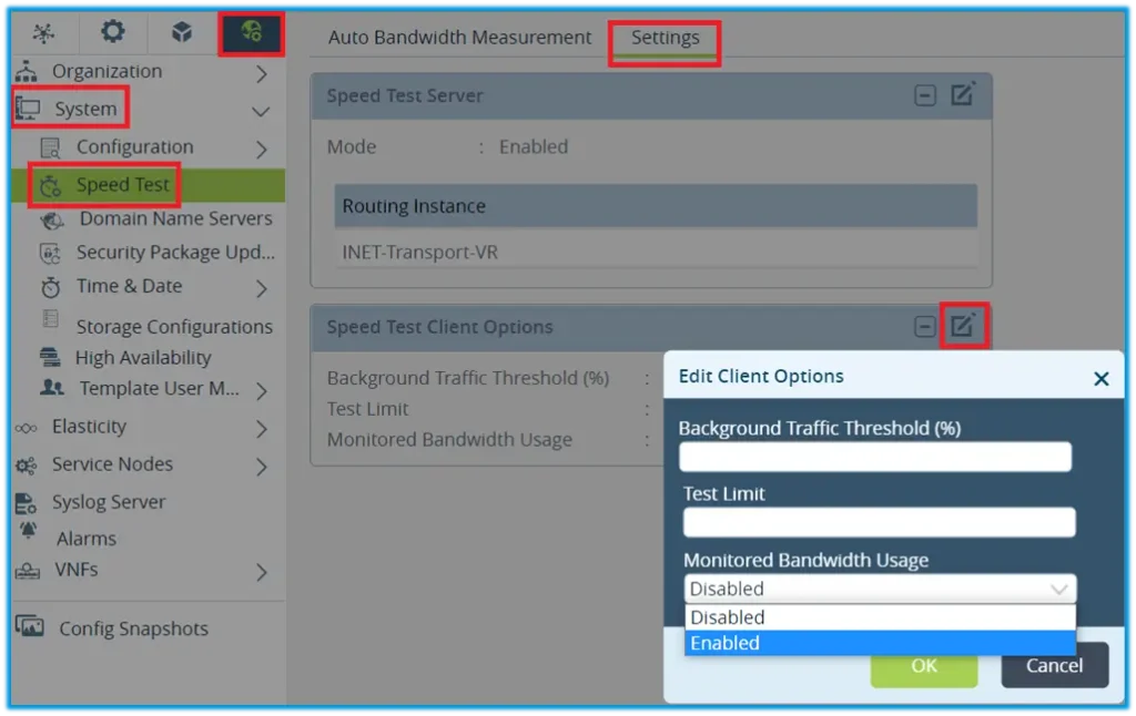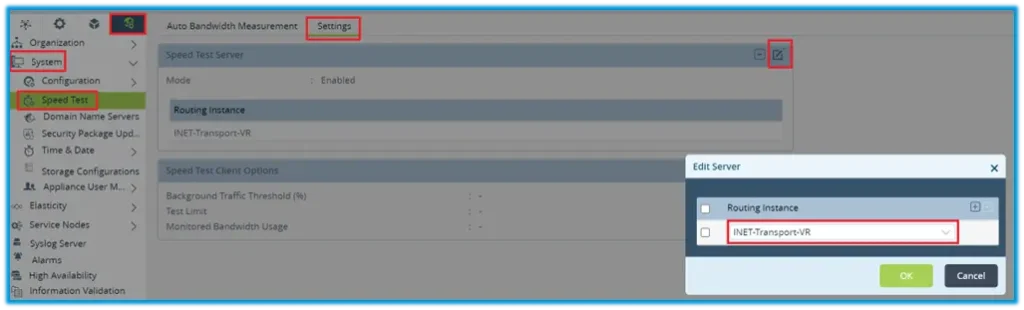 To configure speed test server, navigate to Others -> System -> Speed Test and select Settings tab. Click edit button next to the Speed Test Server and enable it under selected Routing Instances.