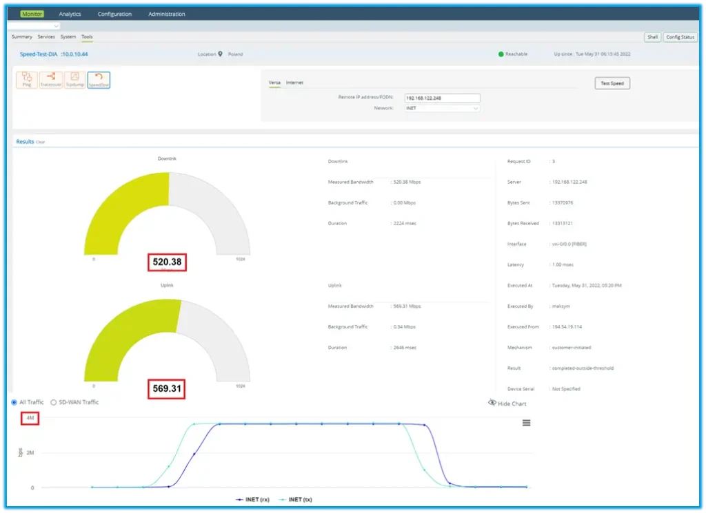 Administrator can measure bandwidth to Versa remote speed test server under Monitor -> Tools -> SpeedTest menu. Provide remote IP address and Network for which bandwidth should be measured. Click Test Speed button. Even the remote destination is a part of the same SD-WAN network, speed test sample packets will not be encapsulated with SDWAN overhead hence it provides the result of the actual underlay performance.