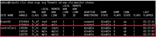 The output below shows the SLA status from the Branch towards the controller and we see that the SLAs are up on all the Transport links.